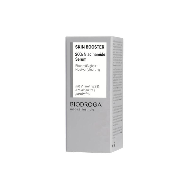 La formulación de BIODROGA Medical Institute SKIN BOOSTER 20% Niacinamide Serum con ácido azelaico anti comedogénico promueve una tez uniforme, poros refinados y una textura de piel suavizada.