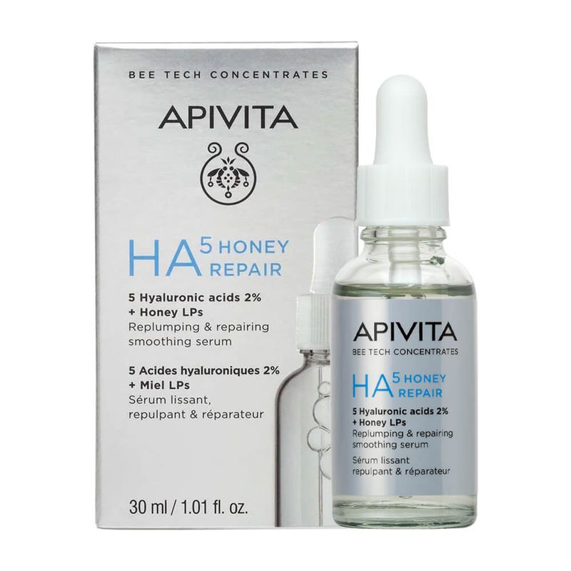 El Sérum Reparador HA5 Miel potencia el poder de la sinergia rellenadora del ácido hialurónico y la miel para reducir visiblemente las arrugas y alisar la piel.