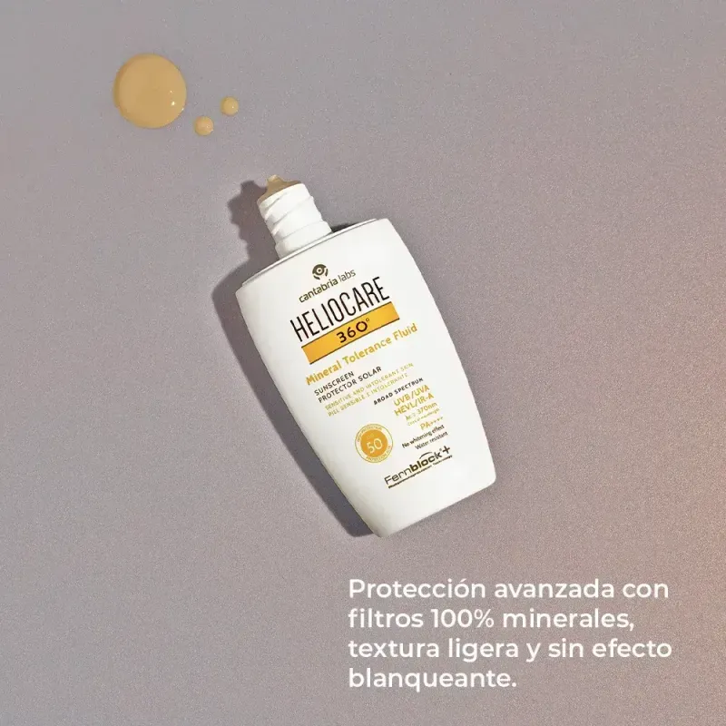 Heliocare 360 Mineral Tolerance Fluid SPF 50 es un fotoprotector fluido con filtros 100% minerales. Fórmula de alta tolerancia con filtros exclusivamente minerales. Su textura ligera permite obtener un acabado invisible incluso en pieles oscuras. Perfecto para pieles sensibles, reactivas e intolerantes. Cumple las más altas exigencias en materia de fotoprotección. Con Fernblock®+, filtros específicos y activos reparadores y antioxidantes, protege frente a las 4 radiaciones (UVB, UVA, Visible e Infrarrojo), neutraliza y repara el daño solar. Testado bajo control dermatológico y oftalmológico.