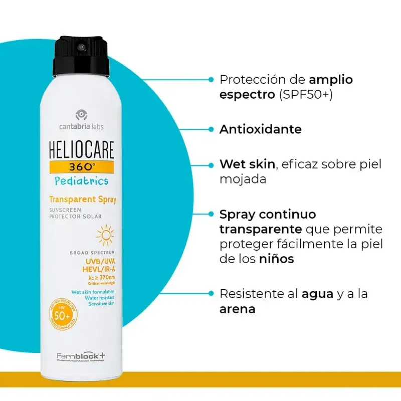 "Su formato en spray continuo transparente, permite proteger fácilmente la piel de los niños. Eficaz incluso sobre la piel mojada gracias a su fórmula WET SKIN, con un acabado invisible y de rápida absorción. Hipoalergénico, resistente al agua y resistente a la arena.