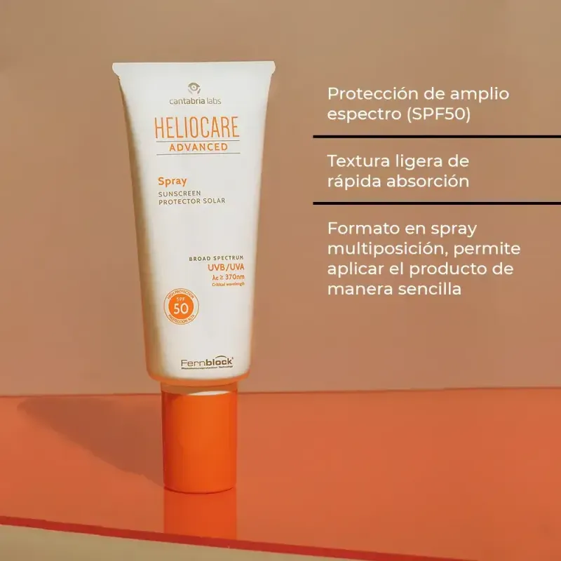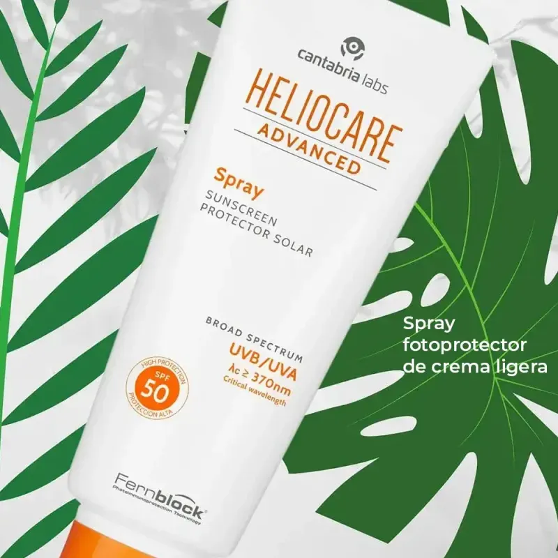Heliocare Spray SPF 50 es un fotoprotector de protección alta formulada con Fernblock®, filtros solares y activos reparadores y antioxidantes, que protege, neutraliza y repara el daño solar. Testado bajo control dermatológico. Su textura ligera de rápida absorción, resistente al agua y fácil de extender es perfecta para la protección de la piel del cuerpo. Su cómodo formato en spray multiposición permite aplicar el producto de manera sencilla y con un excelente acabado.