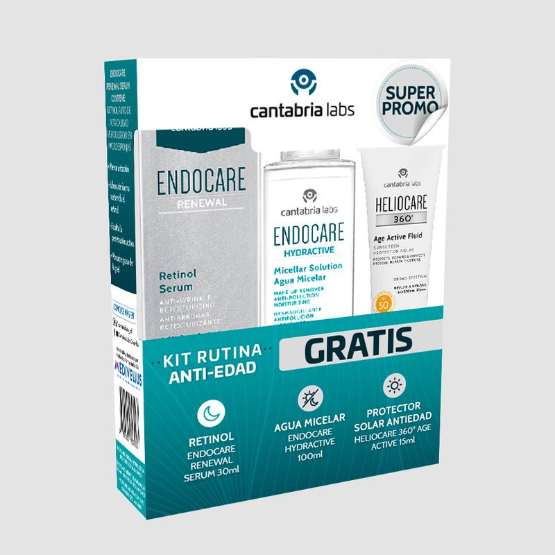 Transforma tu piel con una rutina antiedad completa. El sérum Endocare Renewal 0.2% estimula la renovación celular, reduciendo arrugas y mejorando la textura. El agua micelar Hydractive limpia profundamente sin irritar, y el fotoprotector Heliocare Age Active protege frente al sol y el envejecimiento prematuro.