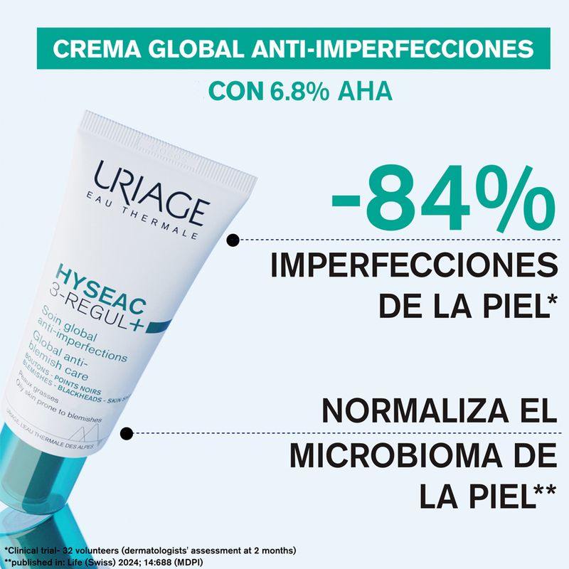 URIAGE Hyseac 3 Regul Global favorece la eliminación de las imperfecciones (granos, puntos negros, brillos) y deja la piel nítida y matificada gracias a un complejo de activos eficaces y al Agua Termal de Uriage. Alisa el grano de la piel de forma significativa y cierra los poros. Limita el exceso de sebo responsable de nuevas imperfecciones, gracias al extracto de regaliz. Textura gel-crema. Ideal para piel grasa.