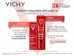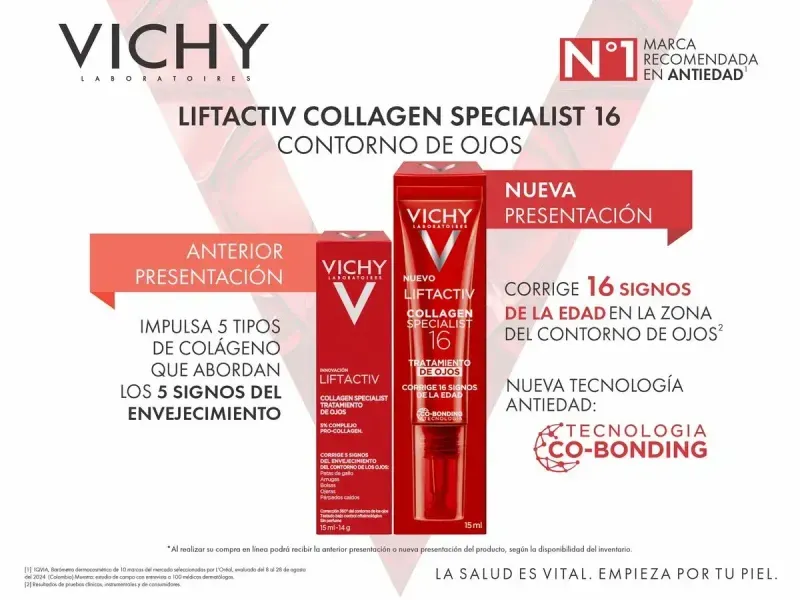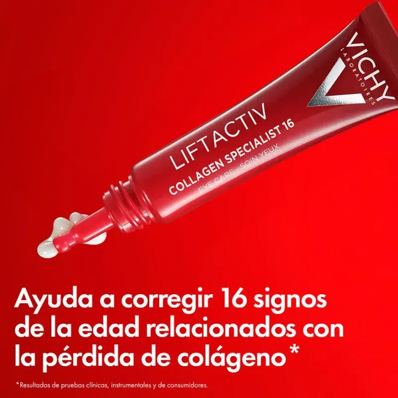 VICHY Liftactiv Collagen Specialist Contorno de Ojos esta enriquecido con procolágeno, péptidos, proxilano, dermicano y vitamina cg, impulsando 5 tipos clave de colágeno que abordan los 5 signos del envejecimiento de los ojos: patas de gallo, arrugas debajo de los ojos, bolsas en los ojos, párpados caídos y ojeras.